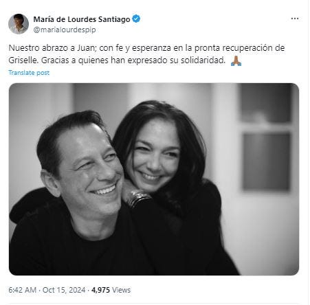 Mientras, la senadora María de Lourdes Santiago, del PIP, escribió Nuestro abrazo a Juan; con fe y esperanza en la pronta recuperación de Griselle. Gracias a quienes han expresado su solidaridad.