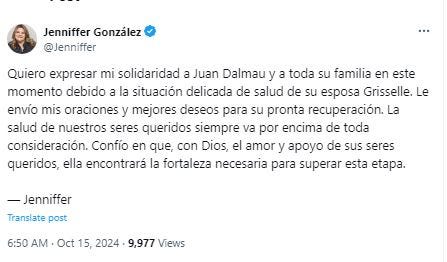 La candidata a la gobernación por el PNP, Jennifer González manifestó en un tuit: “Quiero expresar mi solidaridad a Juan Dalmau y a toda su familia en este momento debido a la situación delicada de salud de su esposa Grisselle. Le envío mis oraciones y mejores deseos para su pronta recuperación. La salud de nuestros seres queridos siempre va por encima de toda consideración. Confío en que, con Dios, el amor y apoyo de sus seres queridos, ella encontrará la fortaleza necesaria para superar esta etapa.