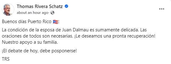 El primero en expresarse fue el senador del Partido Nuevo Progresista, Thomas Rivera Schatz. “La condición de la esposa de Juan Dalmau es sumamente delicada. Las oraciones de todos son necesarias. ¡Le deseamos una pronta recuperación! Nuestro apoyo a su familia. ¡El debate de hoy, debe posponerse!”, clamó.