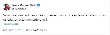 El candidato a la gobernación por el Partido Popular Democrático, Jesús Manuel Ortiz, expresó en las redes sociales: “Vaya mi abrazo solidario para Grisselle, Juan y toda su familia. Estamos con ustedes en este momento difícil”.