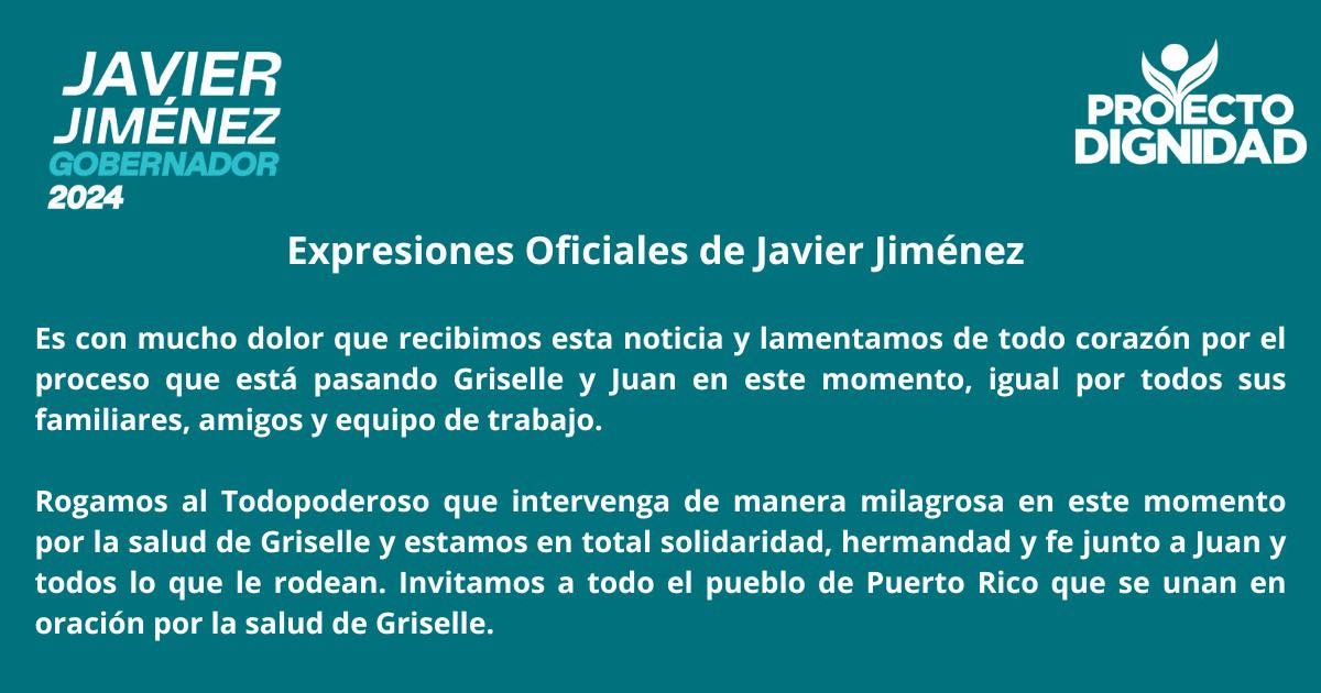 El candidato a la gobernación por el Proyecto Dignidad, Javier Jiménez, emitió las siguientes declaraciones: “Es con mucho dolor que recibimos esta noticia y lamentamos de todo corazón por el proceso que está pasando Griselle y Juan en este momento, igual que por todos sus familiares, amigos y equipo de trabajo. Rogamos al Todopoderoso que intervenga de manera milagrosa en este momento por la salud de Griselle y estamos en total solidaridad, hermandad y fe junto a Juan y todos lo que le rodean. Invitamos a todo el pueblo de Puerto Rico a que se unan en oración por la salud de Griselle”.